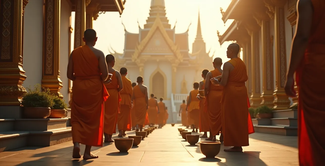 Chaque matin, avant même que le soleil ne se lève, un rituel silencieux et immuable se déroule dans les rues de Thaïlande : la quête matinale des moines, ou tak bat. C’est l’une des manifestations les plus visibles et les plus touchantes de l’interaction entre la communauté laïque et le clergé. Pour le voyageur, y assister ou y participer est une occasion unique de toucher du doigt la spiritualité incarnée du bouddhisme Theravada. Loin d’être une simple transaction de nourriture, ce geste est un acte de mérite (tambun) fondamental, où le fidèle donne pour soutenir la communauté monastique (le Sangha) et le moine reçoit pour pouvoir se consacrer à sa pratique spirituelle.